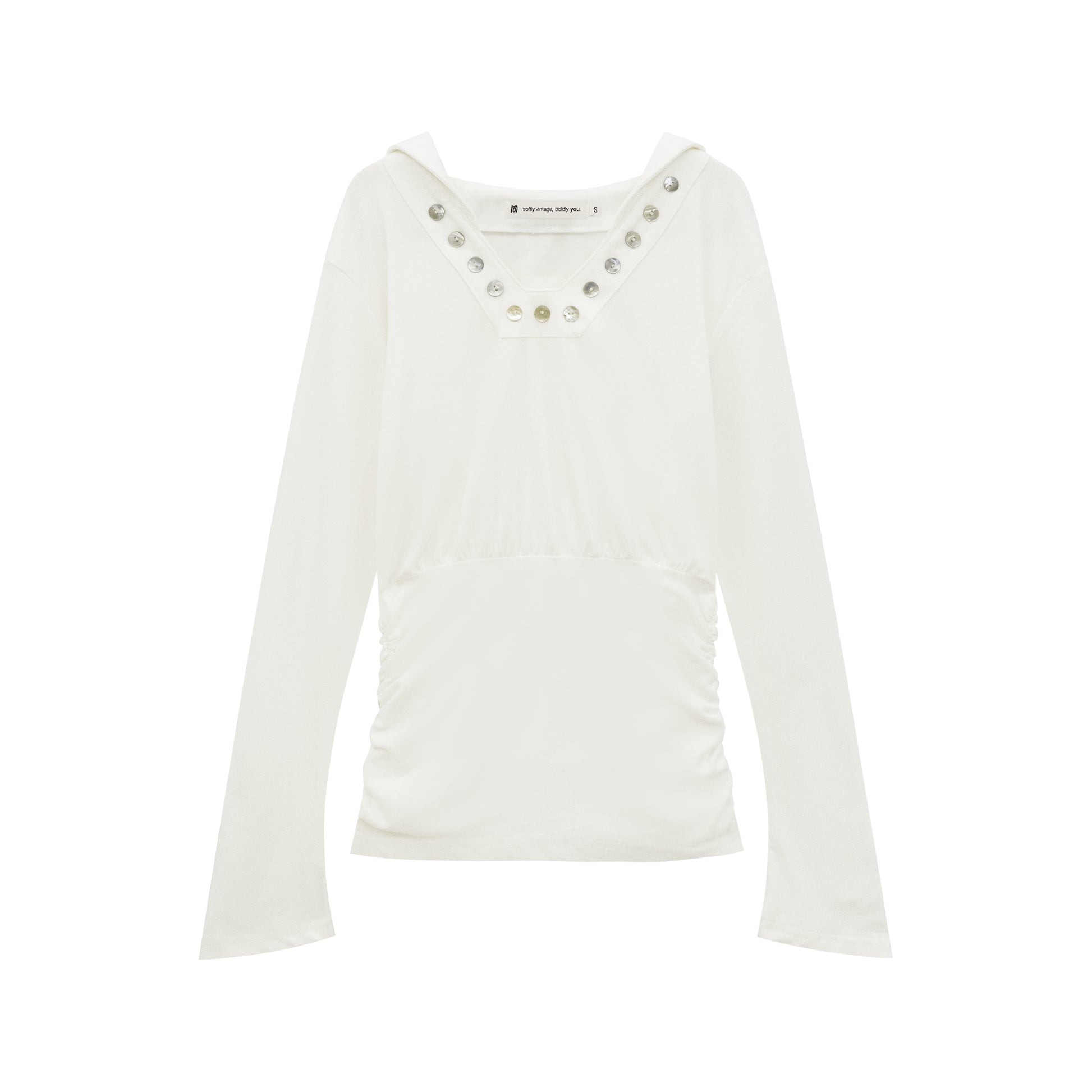 Made from lightweight, smooth fabric that drapes beautifully on the body. Designed with genuine mother-of-pearl buttons at the neckline for a natural, subtle shimmer. The relaxed bust transitions into a softly gathered waist, creating a flattering, cinched silhouette with a touch of 90s grace.